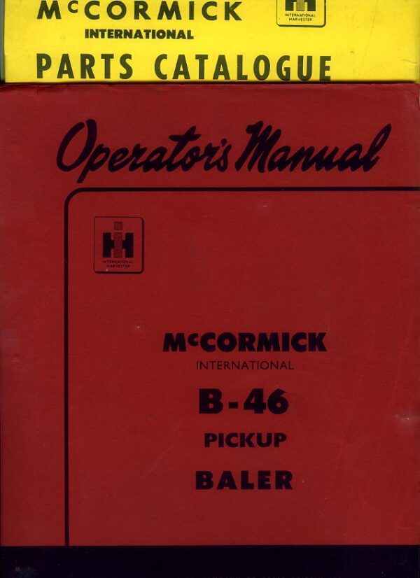 An operators manual in excellent unused condition for the McCormick International B-46 baler, dated 1960. It is complete with a parts book and a guide to timing and tying.