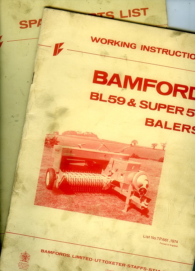 An instruction book for the Bamford BL59 & Super 59 balers, dated 1974, complete with a parts book dated 1973. Both are in good but used condition.