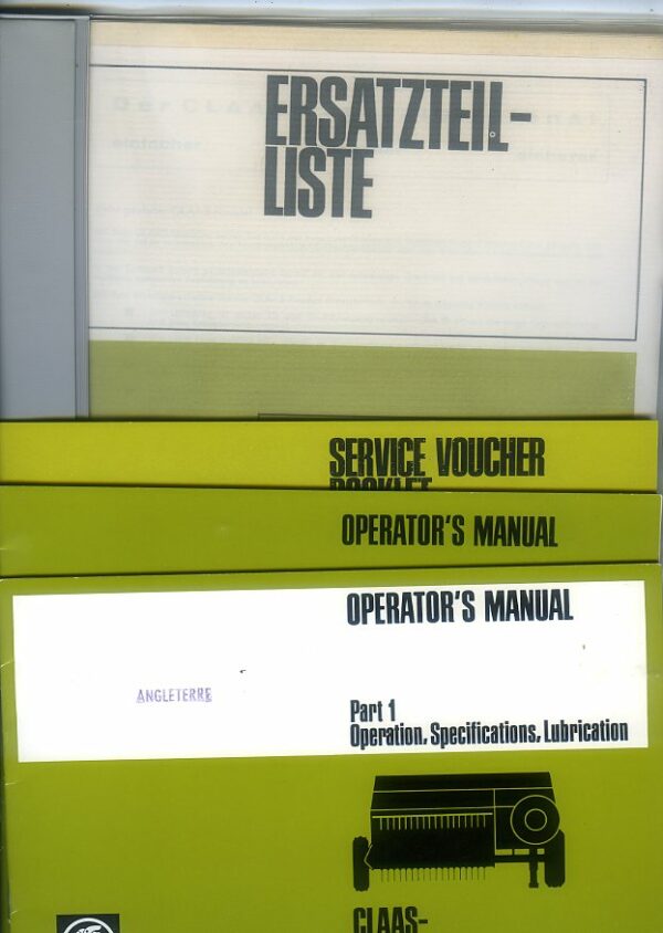 An operators manual in 2 parts plus a parts book and service voucher booklet for the Claas Dominant baler, dated 1972, in as new unused condition; English text.