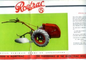 A fold-out brochure for the Monro Rowtrac 5 garden tractor. The brochure is in good conditoin but has small splits to the folds, one of which has been repaired with tape. It is complewte with a price list and copies of an advert for the Rowtrac dated 1935.