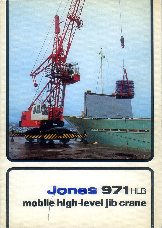 A 12 page brochure in very good condition for the Jones 971 HLB mobile high-level jib crane for ports and harbours, dated 1976.