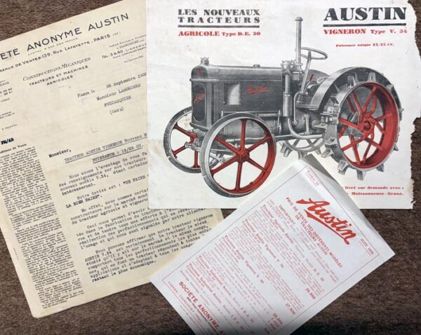 A 2 sided leaflet for the Austin V34 vineyard tractor; French text. The leaflet is in good/fair condition with some damage to the right-hand edge. It is complete with a 4 page covering letter on headed notepaper for the French Austin Company, dated 1930 and a price list dated 1931.