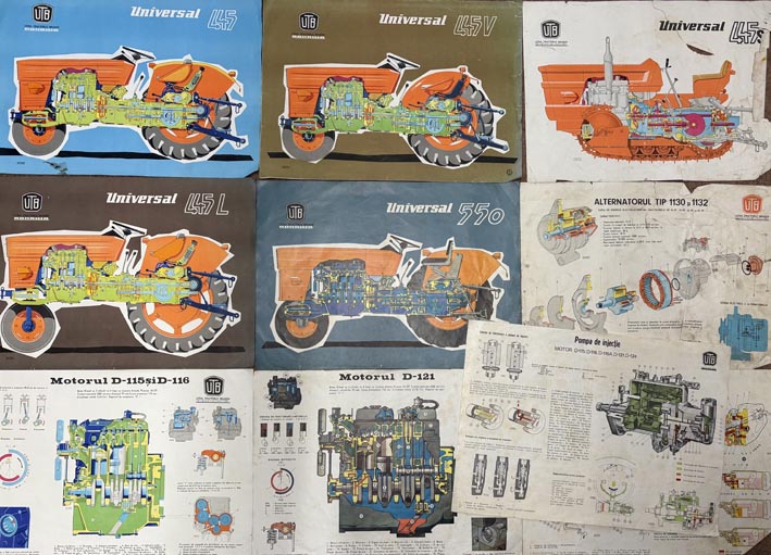 A set of 10 wall charts for the UTB Universal 445 & 550 tractors. Five of the charts show cutaways of the 445, 445V, 445L, 550 & 445S tractors. All are in good conditoin except the one for the 445S crawler which is damaged. Completing the set are 5 technical charts for the alternator, injector pump, hydraulic system and 2 different engines. The technical charts are in good to fair condition with some marks and slight damage. Each chart measures 41cm x 30cm and are in various languages includingย Romanian and English.