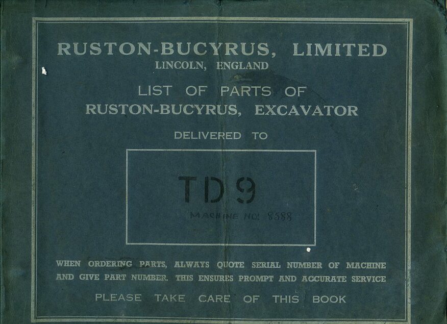 A parts book in good condition for the Ruston-Bucyrus bullgrader and bulldozer attachments for the International TD-9 crawler, dated 1941.