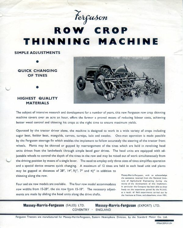 A single sided leaflet in good condition for the Ferguson row crop thinning machine, dated 1954; hole-punched.