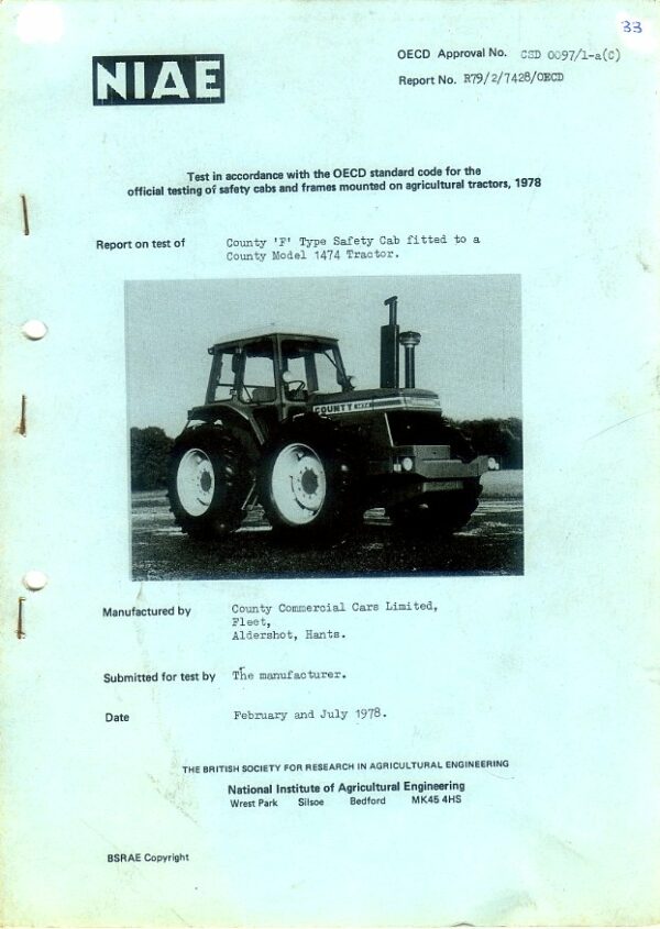 An 8 page NIAEย test report in good condition for the County F-Type safety cab fitted to a 1474 tractor, dated 1978.