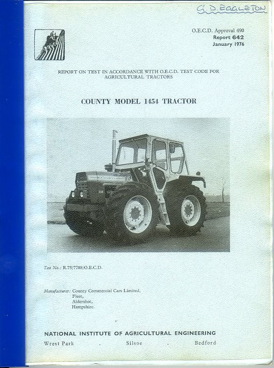 A collection of County tractor NIAE test reports bound with a plastic spine. These appear to be ex-County Commercial Cars and have the name of one of the directors , Geoff Eggleton on the first page. The reports cover the 1454, 1164 with and without cab, 1124 and 754 models, in excellent condition. A remarkable piece of history for the serious County collector.