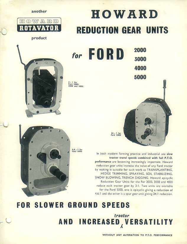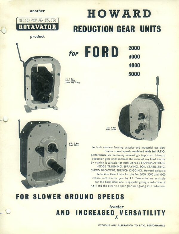 A 2 sided leaflet in very good condition for the Howard reduction units for Ford 2000, 3000, 4000 & 5000 tractors, dated 1966; hole-punched.