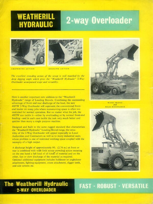 A 2 sided leaflet in good condition for the Weatherill 4HTW 2-way overloader based on the Fordson Major.