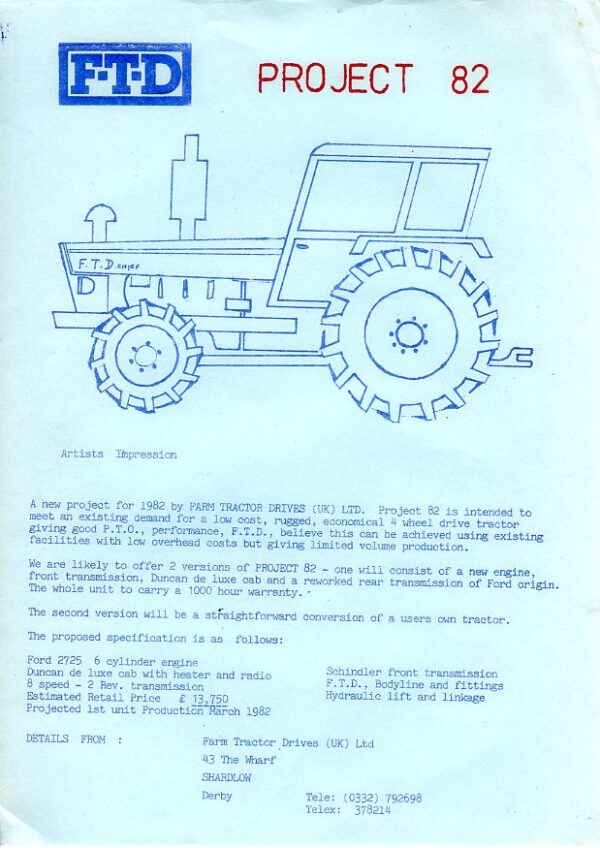 A single sided leaflet for the FTD Project 82, which was the pre-production proposal for the FTD Chieftain tractor for 1982. In very good condition, this leaflet represents an interesting piece of Ford conversions history.