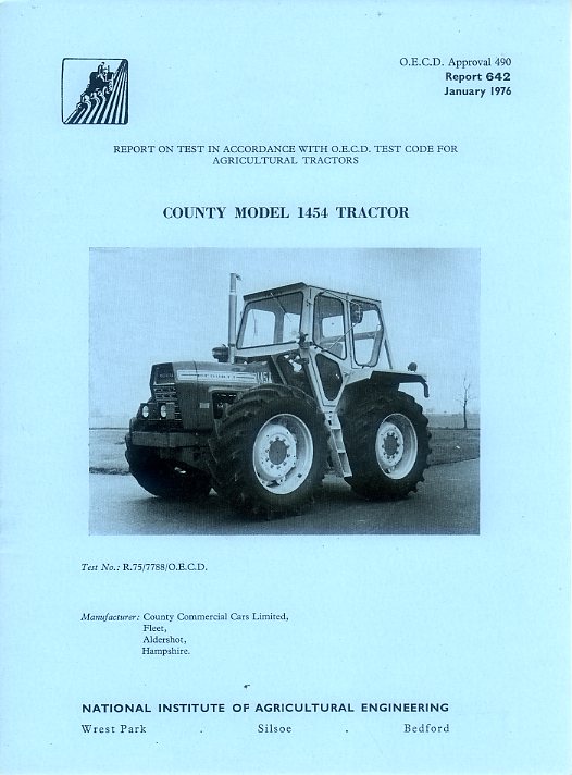 A 24 page NIAE test report in mint condition for the County 1454 tractor, dated 1976.