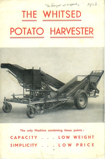 A 4 page brochure for the Whitsed potato harvester with an annotation suggesting that the machine was exhibited at the Royal show at Oxford in 1950. The brochure is in good/fair condition but with some areas on the rear page where the print has lifted.