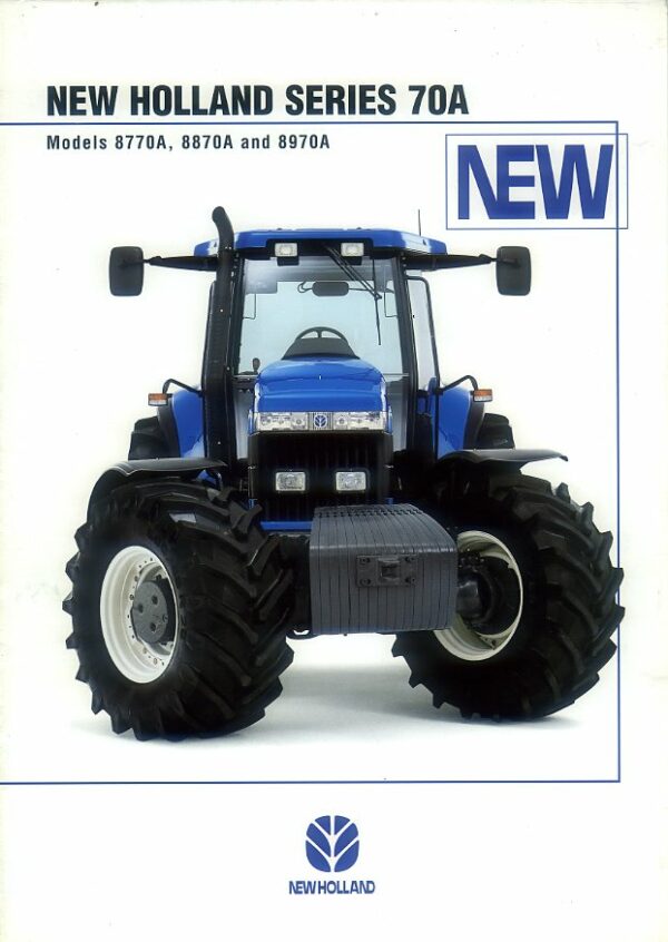 A fold-out brochure in mint condition for the New Holland 8770A, 8870A & 8970A tractors, dated 2000.
