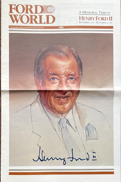 A Ford World publication memorial tribute to Henry Ford ll from 29 September 1987. In newspaper format and fully illustrated with 8 pages, this is an interesting piece of Ford ephemera. it is in mint condition but has been folded.