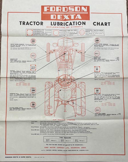 A Castrol tractor lubrication chart for the Fordson Dexta and Super Dexta, dated 1962. The chart has been folded but is in excellent condition.