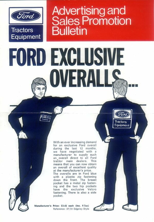 A 2 sided leaflet for Ford Tractors Equipment overalls, dating from the early 1970s. The reverse side of the leaflet shows the range of embroidered overall badges. The leaflet is in excellent condition but has been folded and is complete with order forms. We have not come across this leaflet before. It is a shame that you cannot buy your overalls today for just ยฃ3.42!