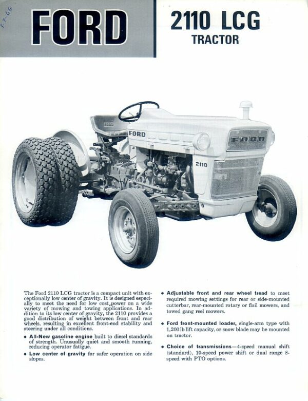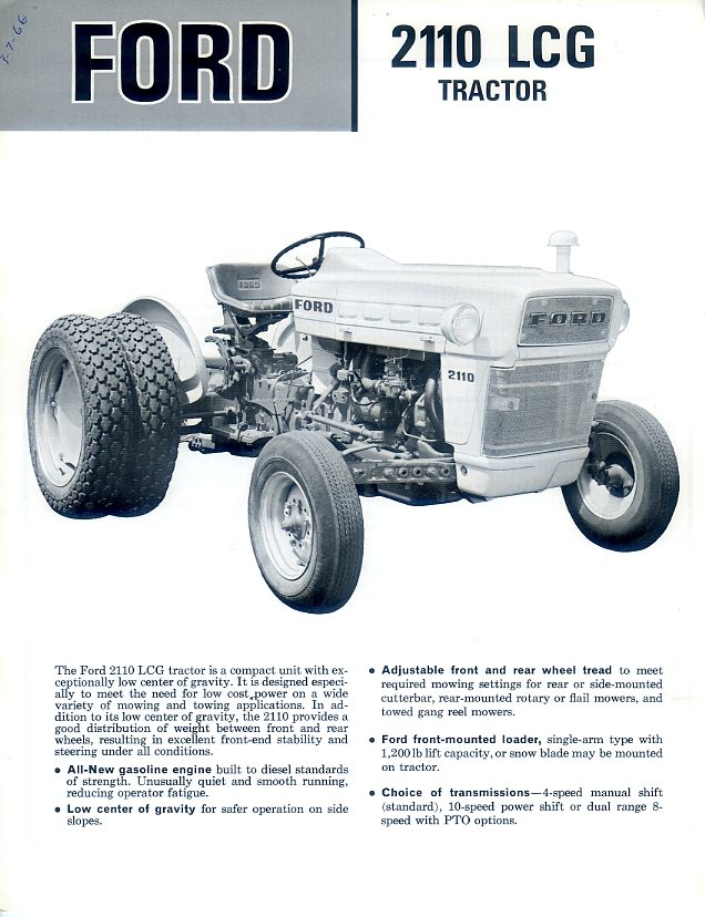 A 4 page brochure in excellent condition for the Ford 2110 LCG tractor for municipal work requiring a low centre of gravity, dated 1965; USA.