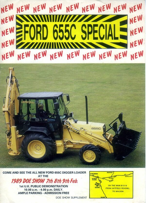 A 4 page brochure in good condition for the Ford 655C Special backhoe loader. This brochure was issued by Ernest Doe for the 1989 Doe Show and also shows the range of industrial products offered by the company.