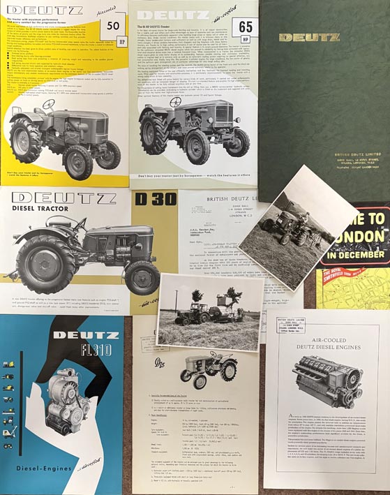 A folder of literature issued by British Deutz Ltd for the 1961 Smithfield Show. It consists of leaflets/brochures for the Deutz D30, 50hp, 65hp & D15 tractors and Deutz air-cooled diesel engines with a brochure for the FL 310 Series. It also includes a covering letter and 2 press photographs of the D15 & D40 tractors.It is all in mint conditoin and English text.