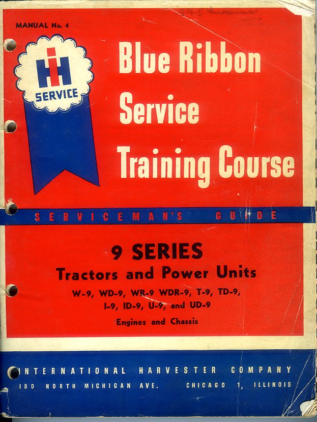 An International Blue Ribbon Serviceman’s Guide to the 9 Series tractors and power units. The models covered include the W-9, WD-9, WR-9, WDR-9, T-9, TD-9, I-9, ID-9, U-9 & UD-9. A very comprehensive book that is complete and clean but with a split to the spine and damage to the centre pages, dated 1947.