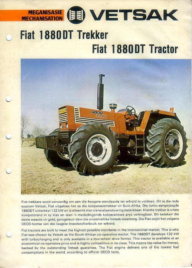 A 4 page South African brochure for the Fiat 1880dt less-cab tractor; English and Afrikaans text. The brochure is in good condition with minor marks and hole-punched.