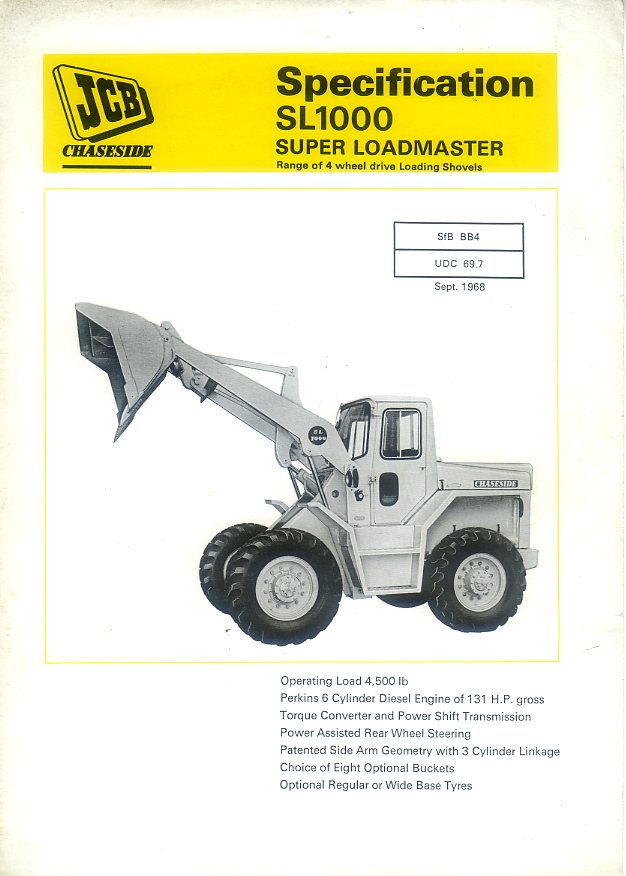 A 4 page spec brochure in very good condition for the JCB Chaseside SL1000 Super Loadmaster loading shovel, dated 1968.