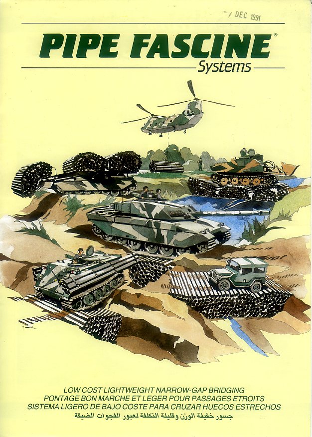 A 6 page brochure in mint condition for Pipe Fascine Systems, which were used for narrow-gap bridging for military applications. It is complete with a leaflet on forestry applications, dated 1991.