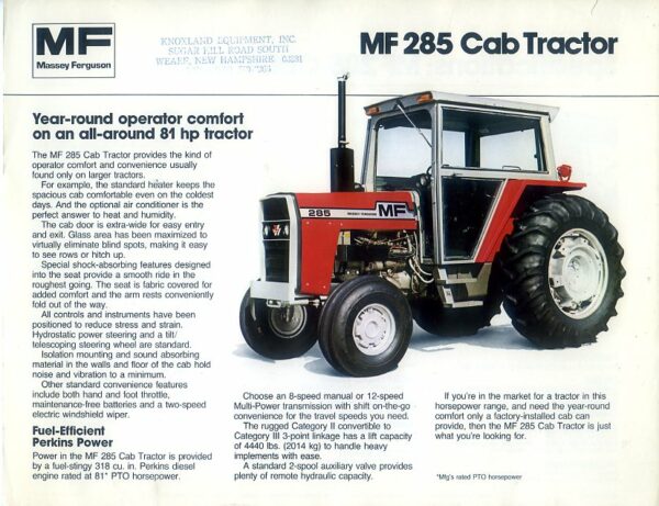 A 2 sided leaflet in mint condition for the Massey Ferguson 285 tractor, dated 1980; USA.