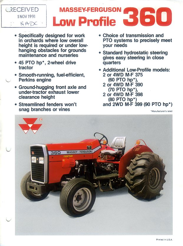 A 2 sided leaflet in excellent condition for the Massey Ferguson 360 low profile tractor, dated 1988 but with a date stamp for 1991; USA , hole-punched.