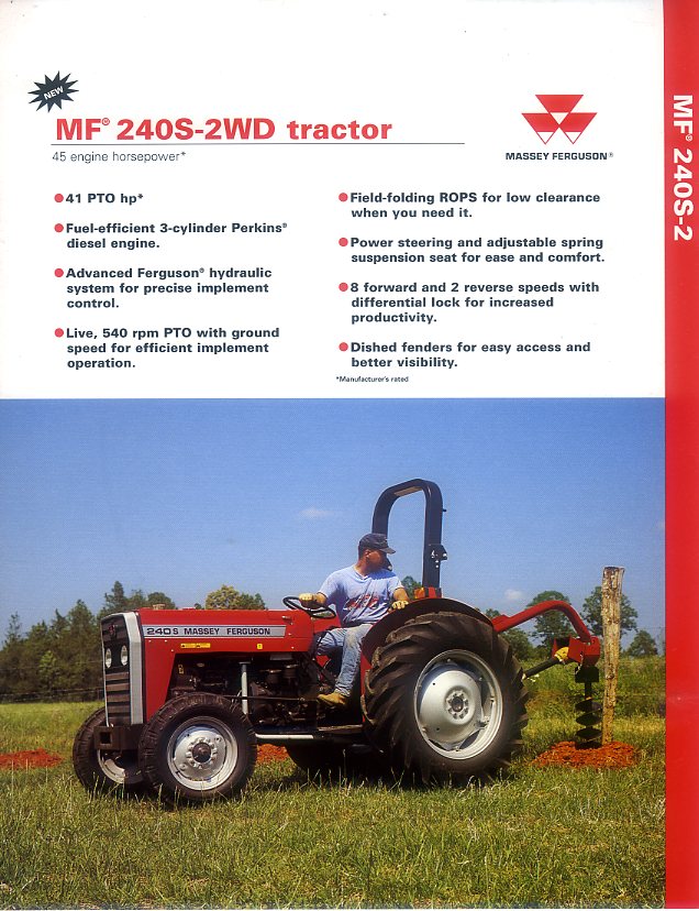 A 2 sided leaflet in mint condition for the Massey Ferguson 240S tractor, dated 1996; USA.