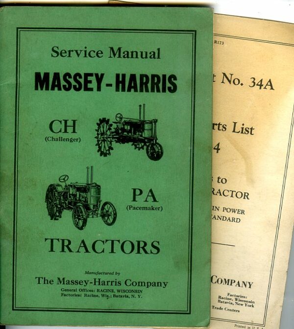 A service manual in excellent condition for the Massey-Harris Challenger and Pacemaker tractors complete with a parts list supplement for the Pacemaker, dated 1939 -40.
