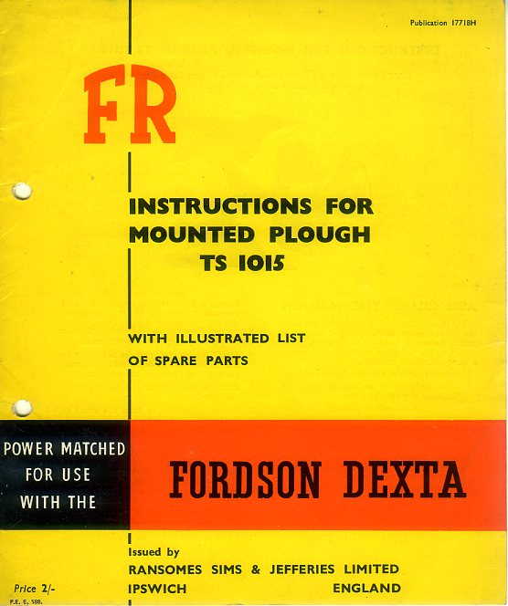 An instruction/parts book for the Ransomes FR TS 1015 plough for the Fordson Dexta, dated 1958.