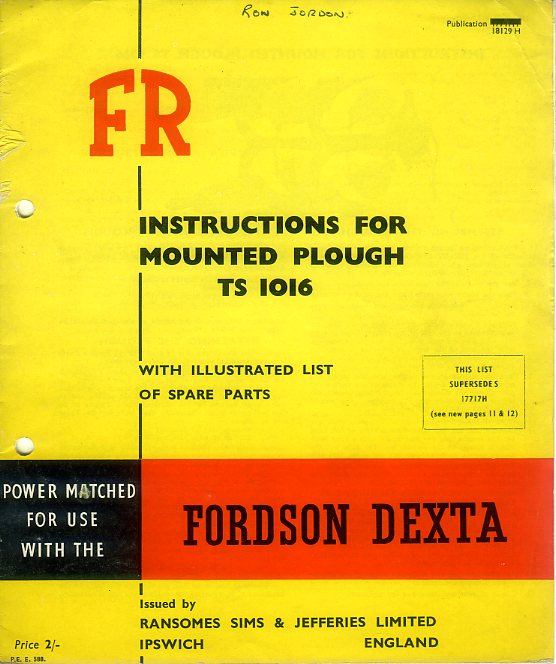 A n instruction/parts book in good condition for the Ransomes FR TS106 reversible plough for the Fordson Dexta, dated 1958.