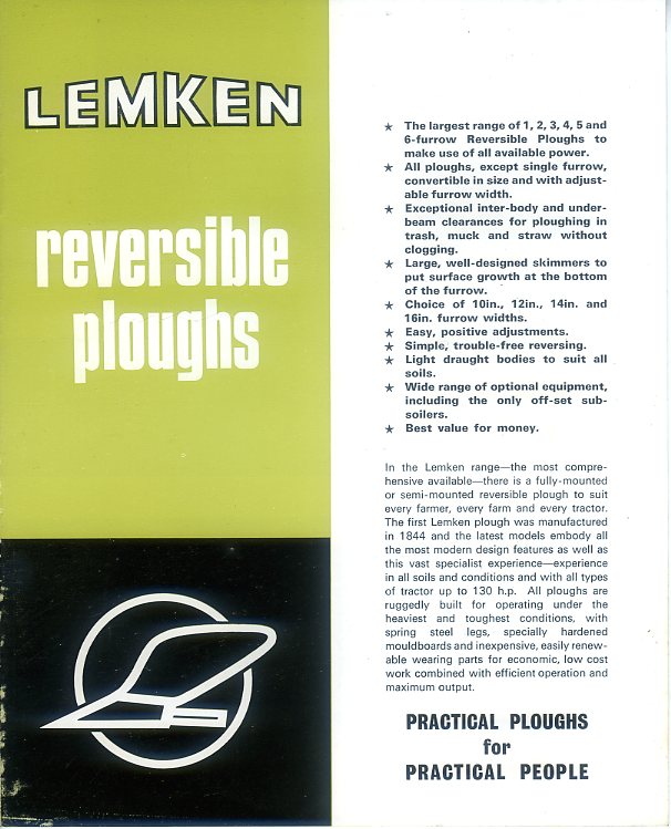 An 8 page brochure in mint condition for Lemken R & RL Series and semi-mounted reversible ploughs, dated 1972.