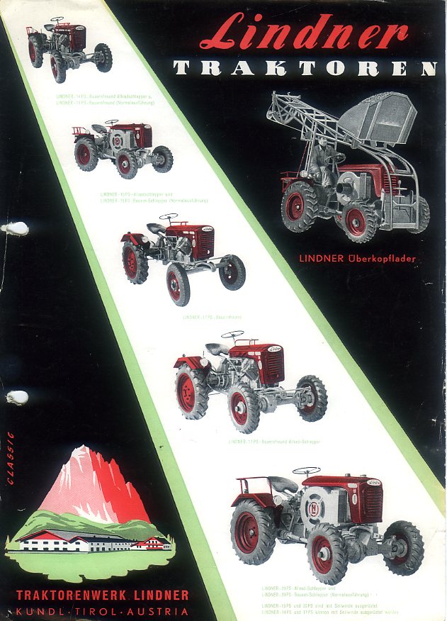 A 2 sided leaflet for the Lindner range of tractors from Austria, dated 1957; German text. The leaflet is in generally good condition but with slight wear to the edges and hole-punchd.